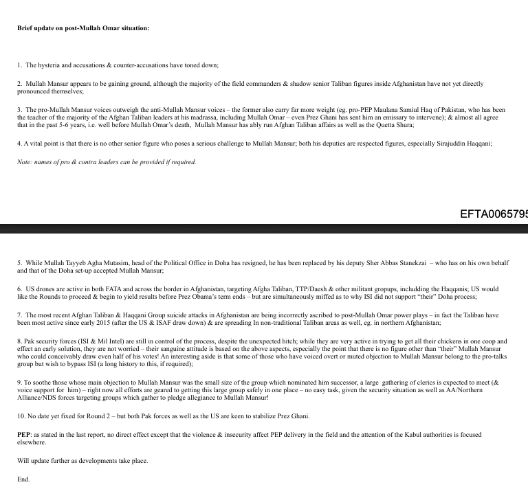 Later that year, Pakistan’s government publicly acknowledged the death of Mullah Omar, the founder of the Taliban and its emir in Afghanistan until 2001. On August 10, 2015, Hassan sent a report suggesting she enjoyed special insight and connections within the Taliban, as well as information sourced from the Pakistani military establishment.
