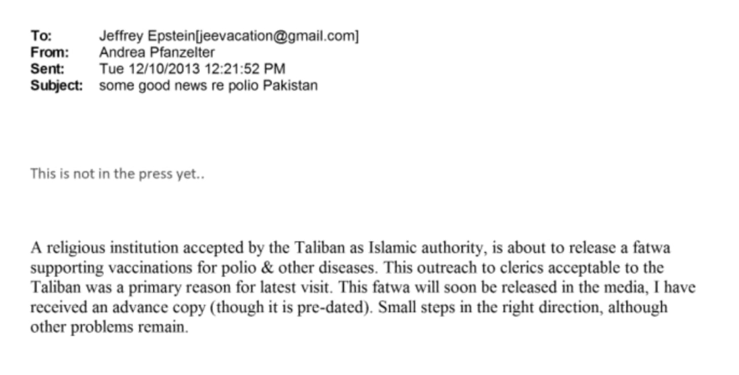 The following month, Pfanzelter forwarded an email to Epstein with the comment, “This is not in the press yet,” explaining that a religious institution accepted by the Taliban was about to issue an edict supporting vaccinations for polio and other diseases. “This outreach to clerics acceptable to the Taliban was a primary reason for latest visit,” the note read, adding, “This fatwa will soon be released in the media, I have received an advance copy (though it is pre-dated). Small steps in the right direction, although other problems remain.”