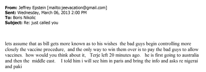 At 3 a.m. the same night, Epstein wrote a separate email to Nikolic, conveying the seriousness of Gates’s blunder: “terje called meto say that the paki press said that bill is having a call with Imran Kahn today publicly , a highly politzied issue, and that this will set back his polio program.”