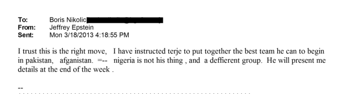 Along with Afghanistan and Nigeria, Pakistan was one of the last countries where polio remained endemic. But the politics of the U.S. war in Afghanistan made international NGO work in Taliban-controlled areas of Pakistan difficult—a fact Epstein was acutely aware of. The next day, he emailed Nikolic again, “Re Afghanistan, does foreign corrupt practice act apply to foundation work?” Epstein wanted to know if the law, which prohibits U.S. companies from bribing foreign officials, would apply to payment for the Taliban. In the email thread, Epstein then asked Nikolic if he was free to explore the possibility of bribing the Taliban to build a relationship with the group even if the money could be used for weapons. “Lets assume … the bad buys begin controlling more closely the vaccine procedure, and the only way to win them over is to pay the bad guys to allow vaccines,” Epstein asked. “How would you think about it.”