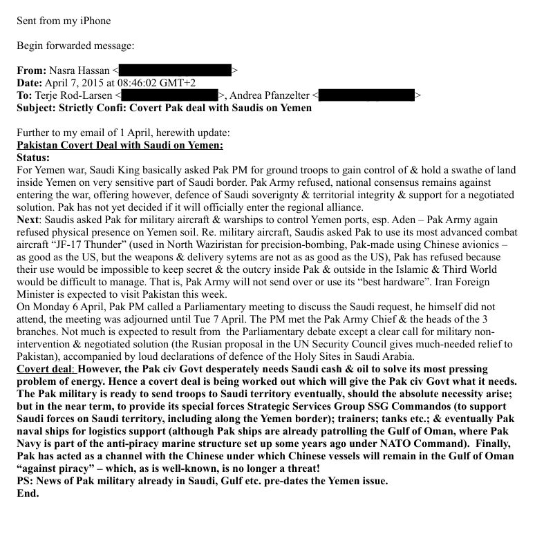 On April 7, 2015, Hassan sent a detailed report on Pakistan’s internal deliberations about cooperating with Saudi Arabia, suggesting she had deep access in the Pakistani government and military establishment, drawing from her long career and expertise in counterterrorism work. None of these deliberations have ever been reported by the Pakistani media.